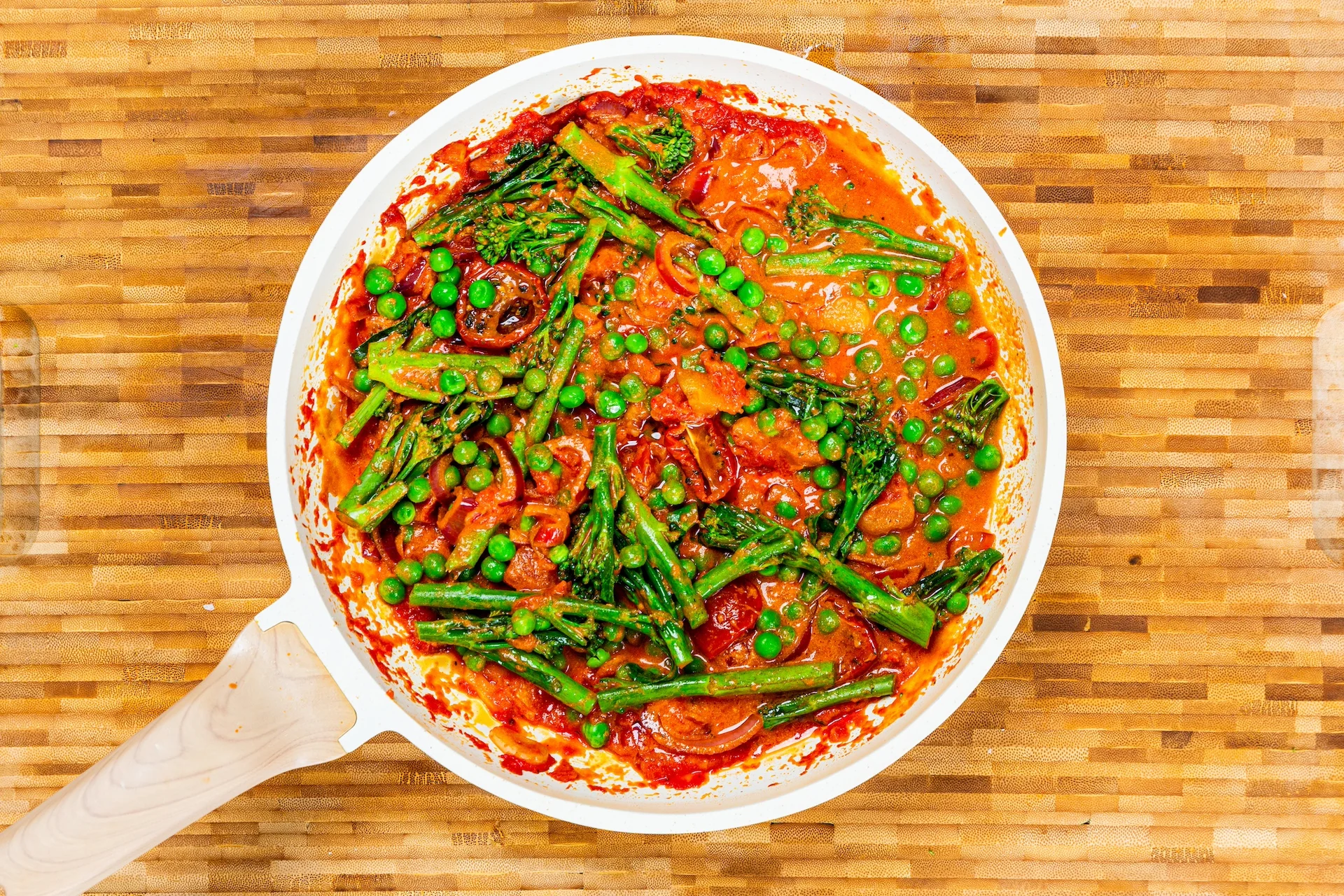 5. Add broccoli and cook until tender. Then, add the garden peas and mascarpone, and simmer for two minutes.