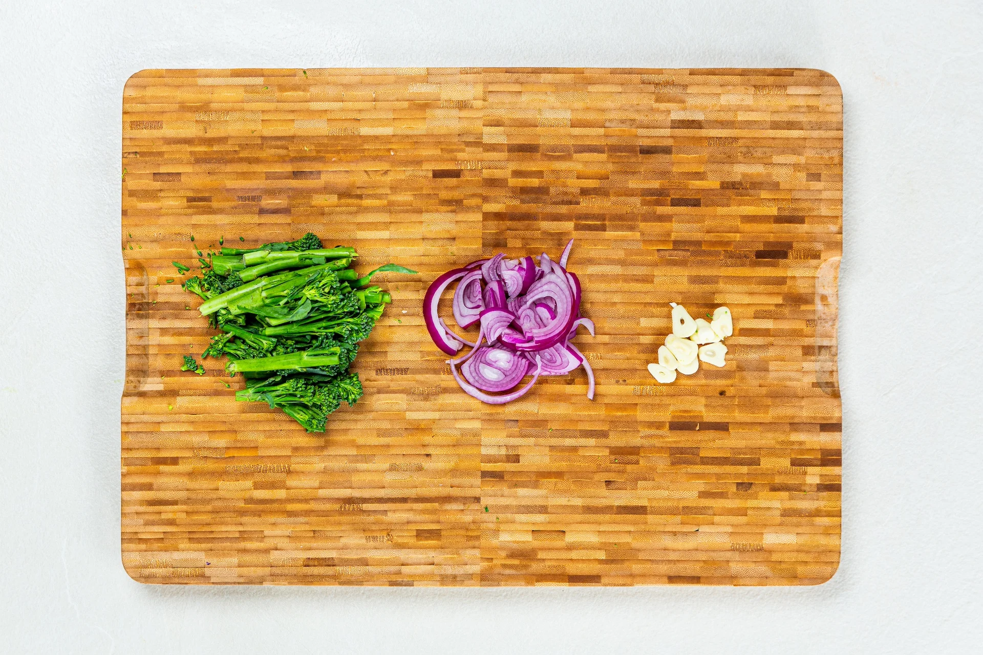 2. Slice the onion, chop the garlic, broccoli and parsley.