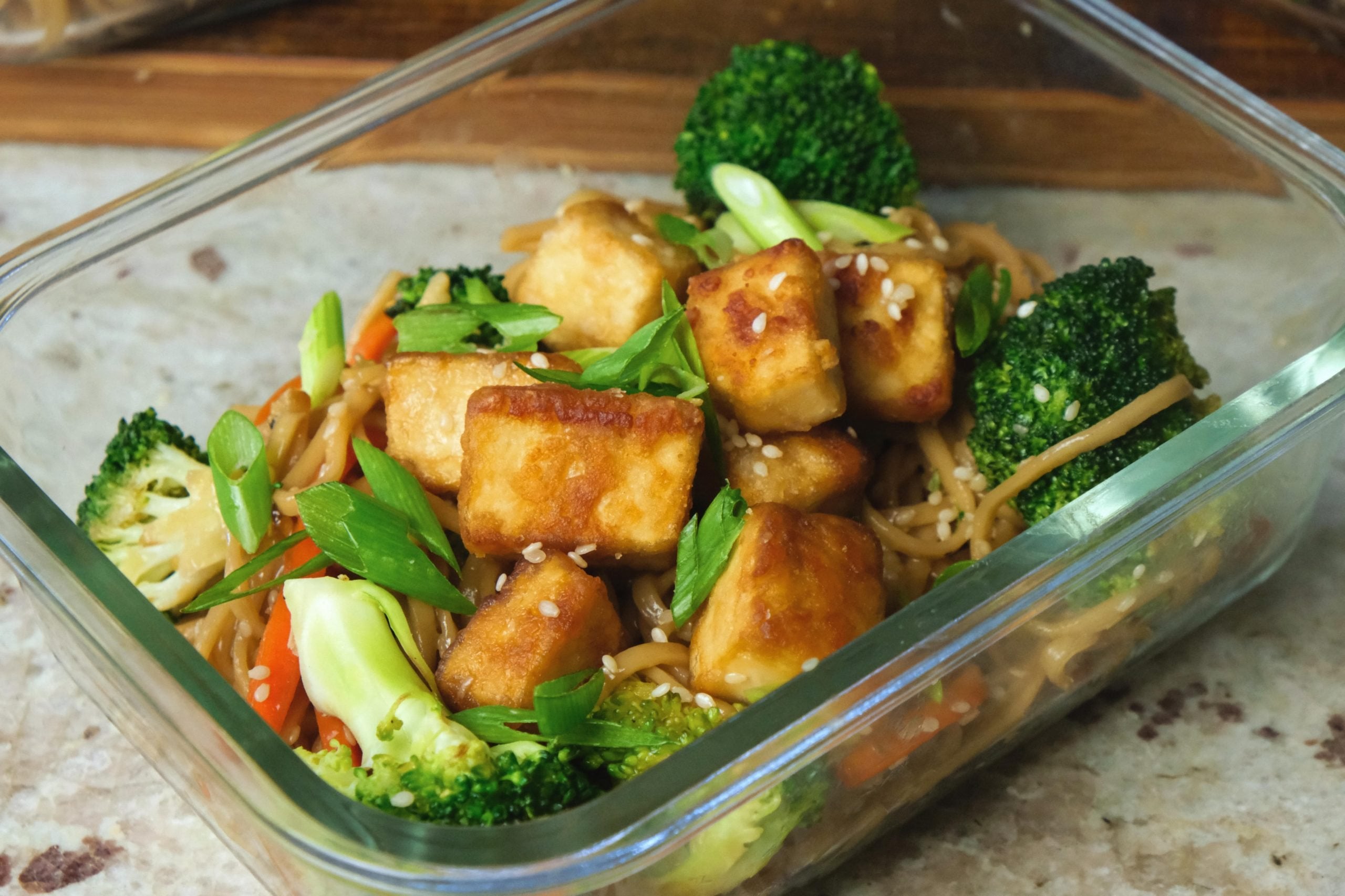 Divide teriyaki noodles between 4 meal prep boxes, serve crispy tofu on top, and garnish with spring onions. Sorted.