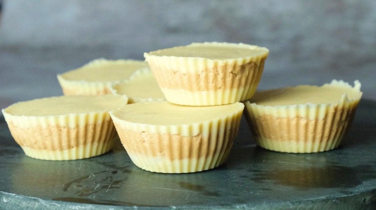 Now mix together the melted peanut butter, vanilla protein powder, and maple syrup — you should get quite a solid, almost dough-like consistency. Divide this into the 6 cupcake moulds on top of the white chocolate layer. - Add the remaining melted white chocolate on top of the peanut butter filling and chill in the fridge again until set, usually around 1 hour.