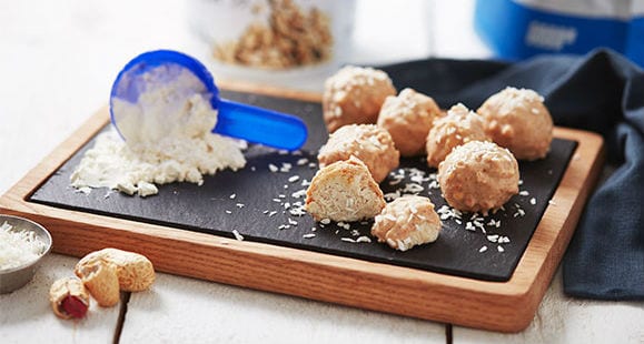 1) To a food processor (or a bowl and stir) add the whey protein, instant oats, 1tbsp coconut and 30ml almond milk (you may need a little more or less milk to reach the right consistency).