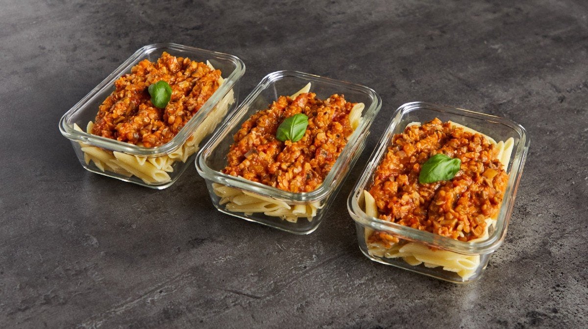 Serve immediately on a bed of freshly cooked pasta or spaghetti and garnish with fresh basil. Portion up any remaining servings into meal prep containers to enjoy later in the week.