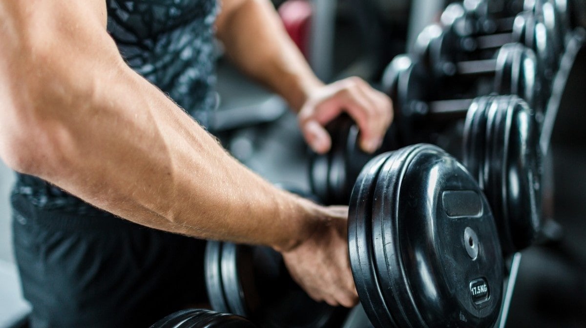 - Hold the dumbbells with your palms facing into your body with a slight lean forward to allow space for the movement