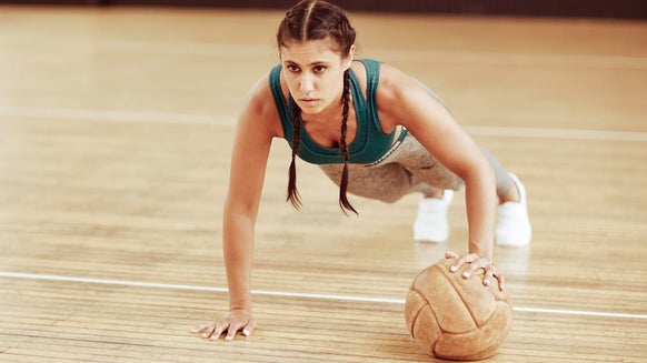 Lie on your back with heels on a stability ball and knees at a 90-degree angle. Push your hips up to fully extend and then roll the ball away from you and back in.