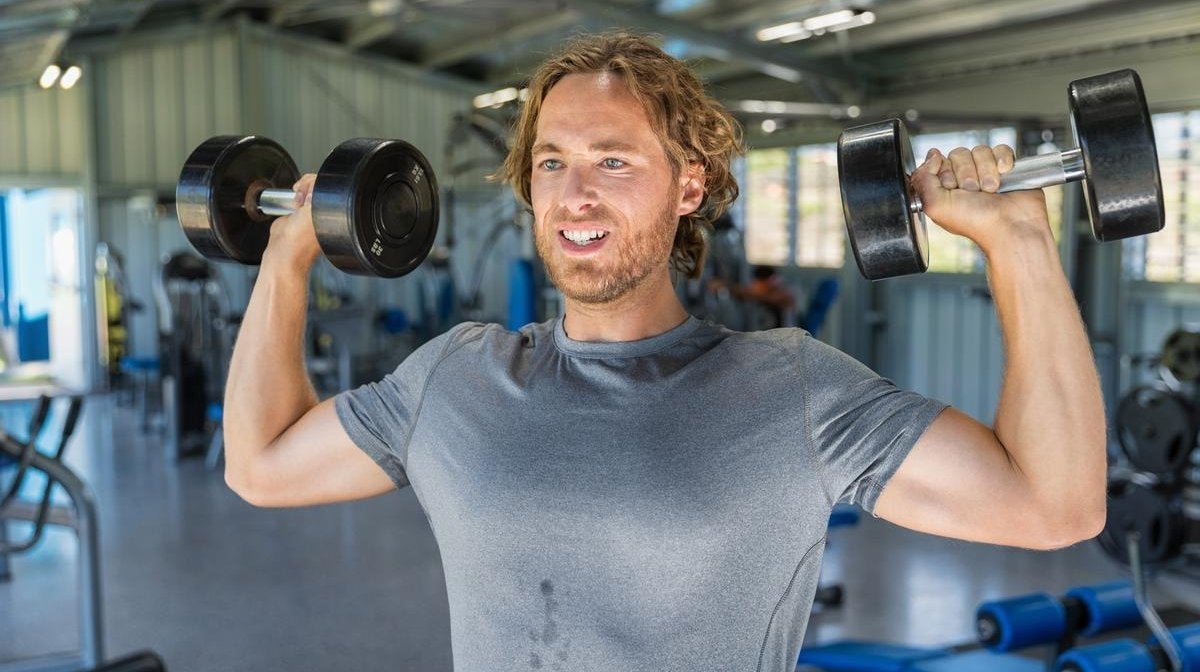 - Use a partner to help place the dumbbells in position above your head, or pick the dumbbells up off the floor by deadlifting them onto your knees and then bring them up to your start-pressing position by flicking them up off your knees one at a time.